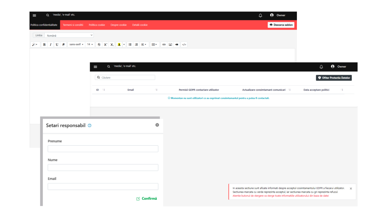 Platforma vine cu texte predefinite de confidențialitate, termeni și cookie-uri – toate ușor de editat și adaptat afacerii tale. Nu te mai stresezi cu legalități, le ai deja integrate.